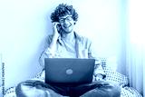 Caucasian Freelancer Guy Talking On Phone Using Laptop Computer Communicating Online Working on the bed in the room, Distance Work And Mobile Communication Concept.