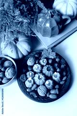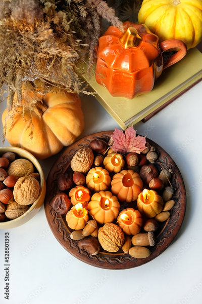 Autumn background. Pumpkin shape cup, nuts, pumpkin, decorative candles, books, dry grass on table. symbol of fall season. home cozy composition for Halloween, Thanksgiving holiday. top view