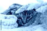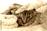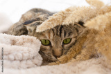 Funny domestic striped kitten plays with dry flowers lying on a plaid. Autumn background with cute animal, selective focus.
