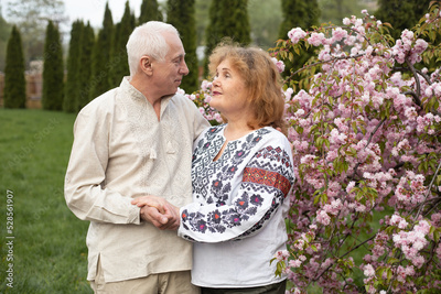 Senior couple having fun in summer or spring nature near sakura blooming tree wearing Ukrainian embroidered shirt