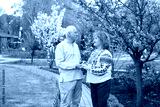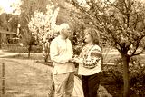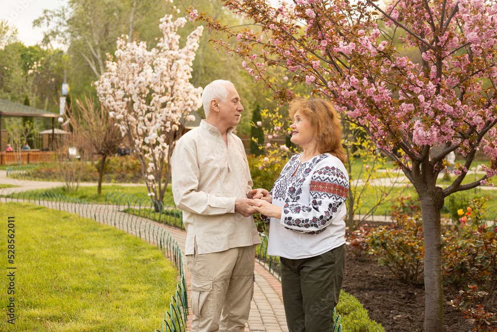 mature couple wearing Ukrainian embroidered shirt standing in park in spring or summer near sakura blooming tree