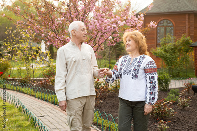 elderly couple wearing Ukrainian embroidered shirt relaxing in park in spring or summer near sakura blooming tree