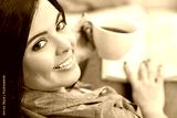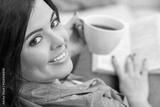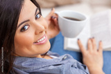 Happy Hispanic Woman Reading Book at Home and Drinking Tea or Coffee