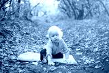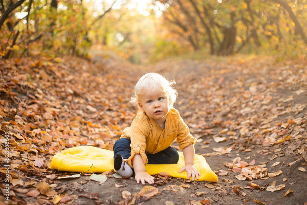 Little boy in autumn background with golden and red trees. Thanksgiving holiday season.