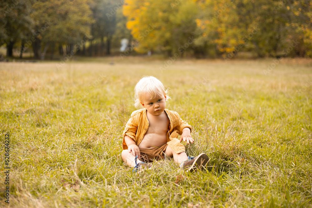 Autumnal mood. Little child boy in autumn orange and golder leaves, outdoor.
