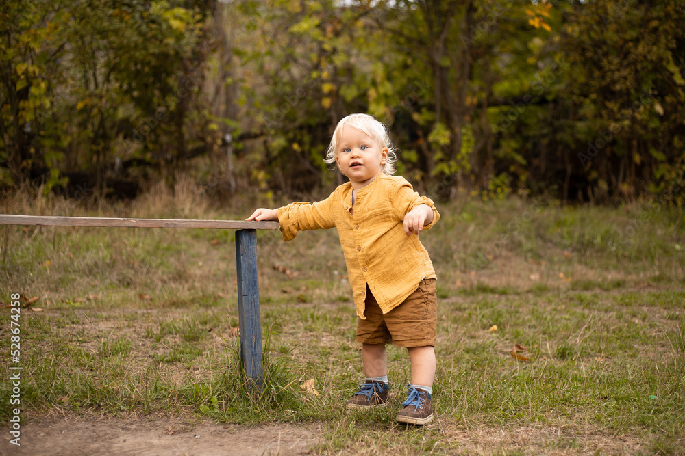baby toddler boy laughing outside in park on summer or autumn day