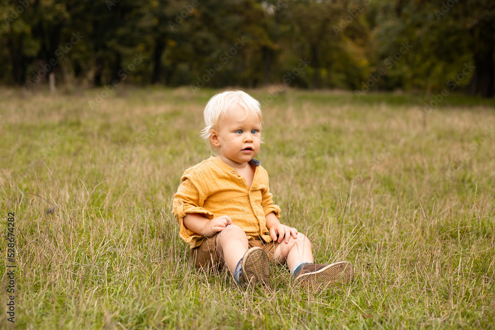 happy baby boy sitting in meadow and smiling in warm autumn or summer park with golden trees