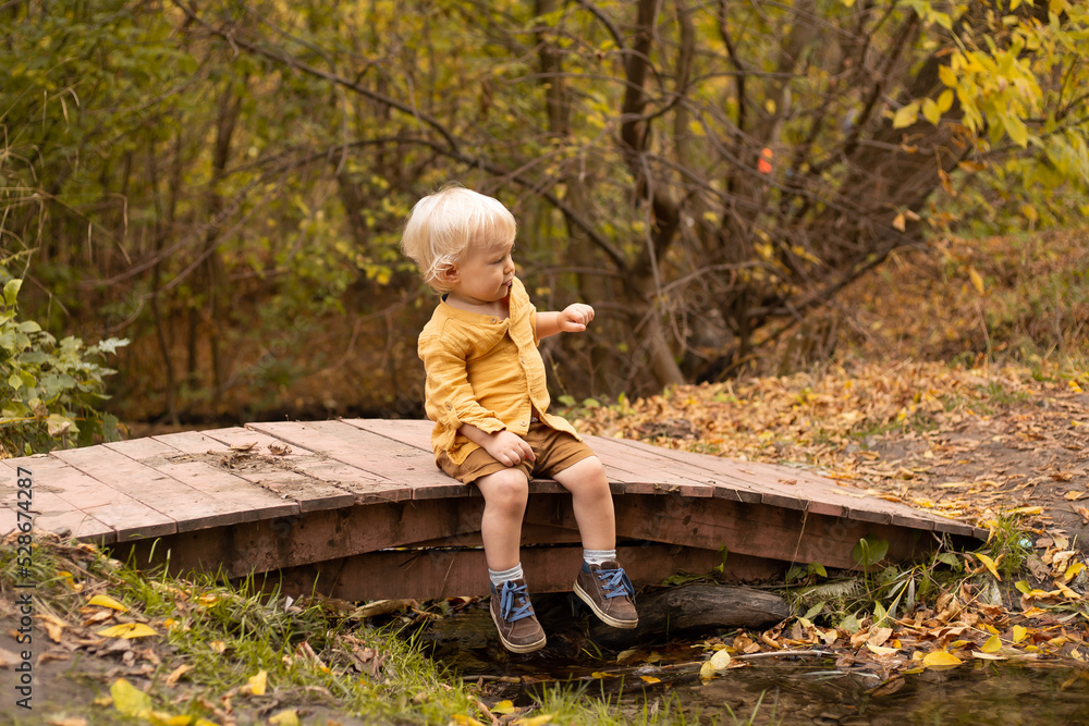 toddler boy sitting on bridge over the stream in autumn park with golden trees.