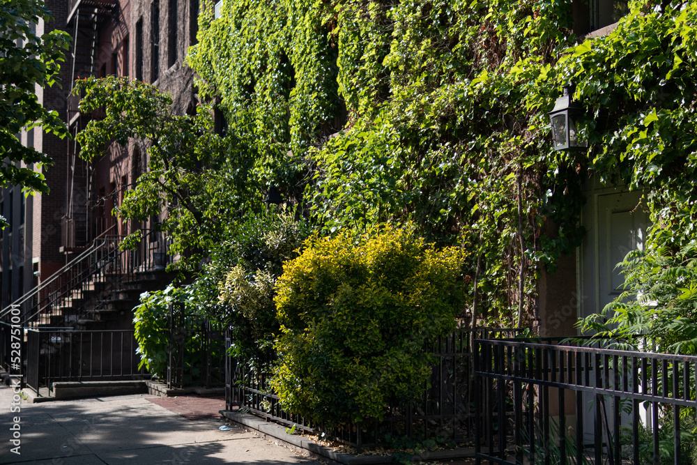 Row of Beautiful Ivy and Vine Covered Brownstone Homes in Hell's Kitchen of New York City