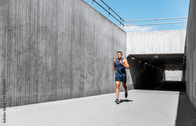 fitness, sport and healthy lifestyle concept - young man running out of tunnel