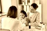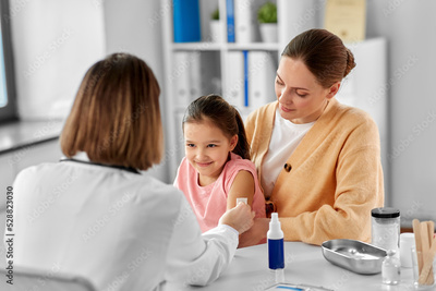medicine, healthcare and pediatry concept - female doctor or pediatrician disinfecting arm skin of little girl patient with mother at clinic