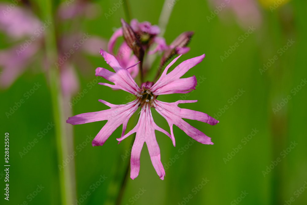 Pink flower in shallow depth of field with blurred green background. Ragged-Robin (Silene flos-cuculi).