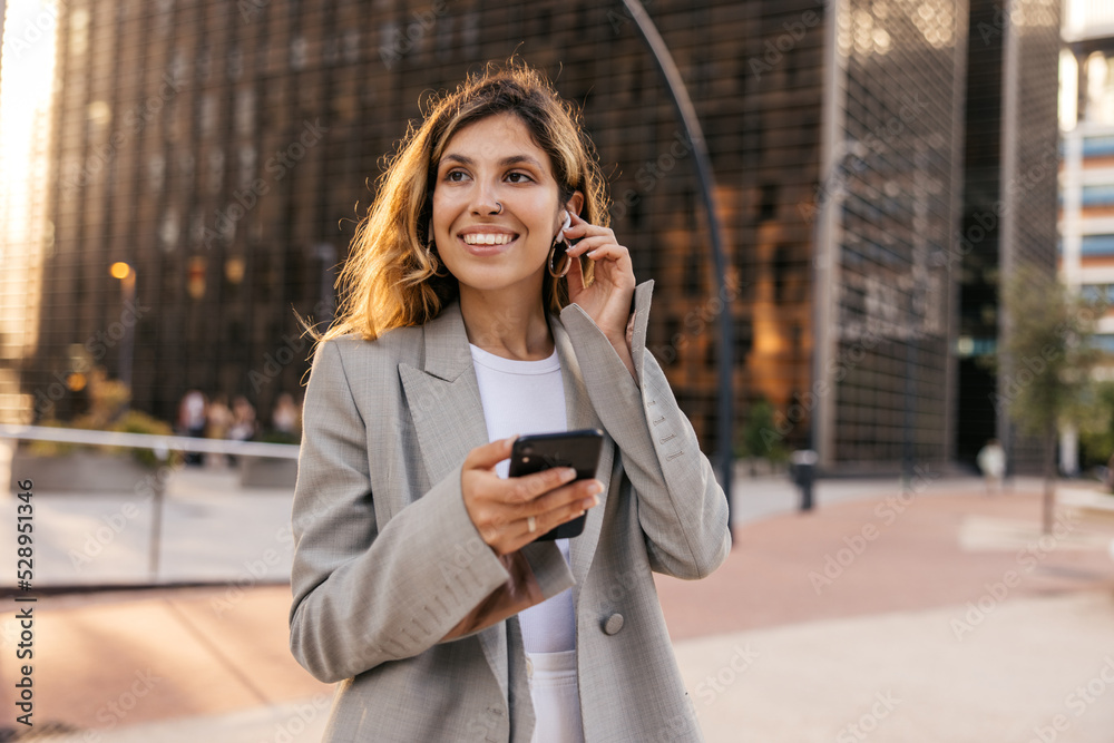 Pretty young caucasian woman is using smartphone spending time outdoors. Brown-haired girl looks away, wears grey jacket. Technology concept