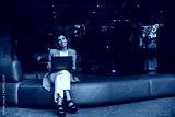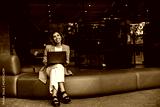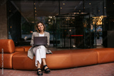 Nice young caucasian girl is holding laptop checking mail, sitting in room. Blonde wears grey jacket, white pants. Office worker concept