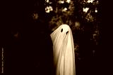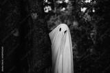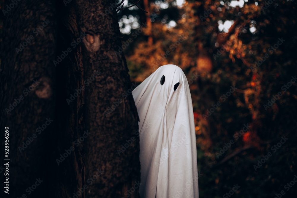Ghost standing behind the tree in forest during Halloween
