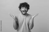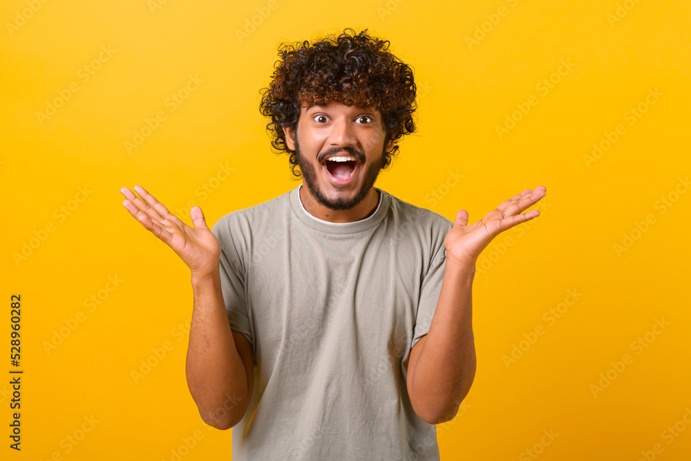Astonished Indian young curly man screams wow and looking at the camera with mouth wide opened, surprised happy guy excited with incredible promotion, standing isolated on yellow
