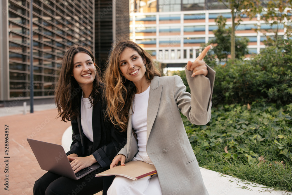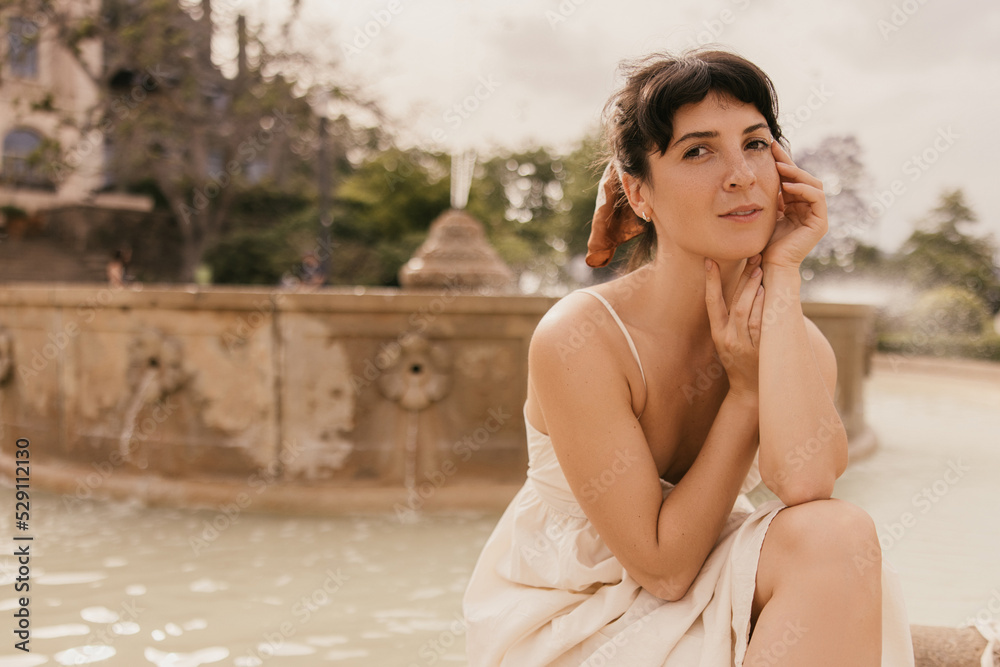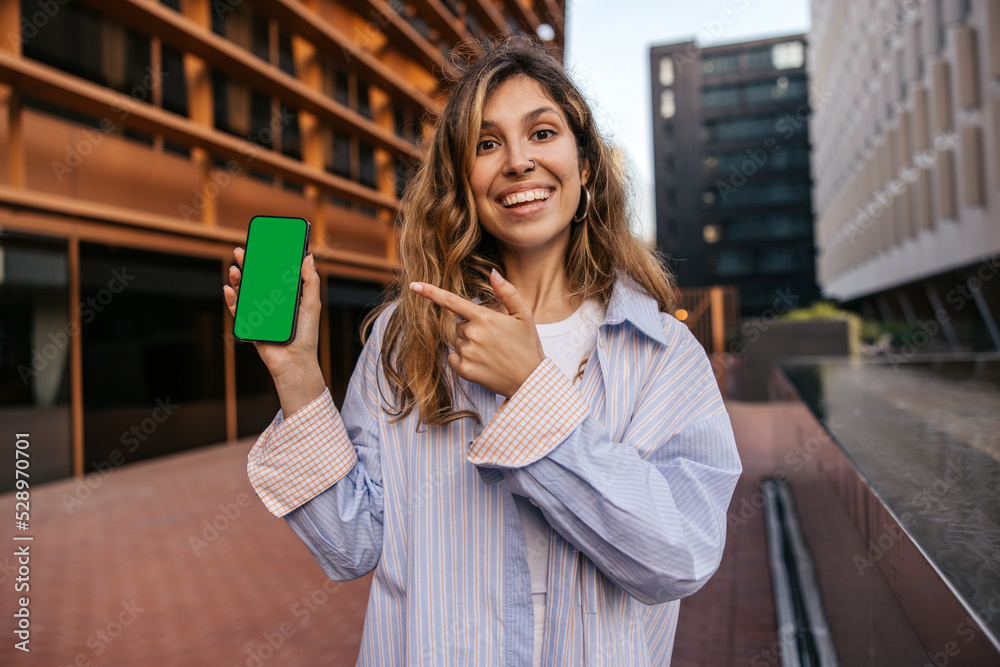 Pretty young caucasian woman with phone and headphones sits on bench against backdrop of buildings. Blonde wears shirt and pants in spring. Music concept.
