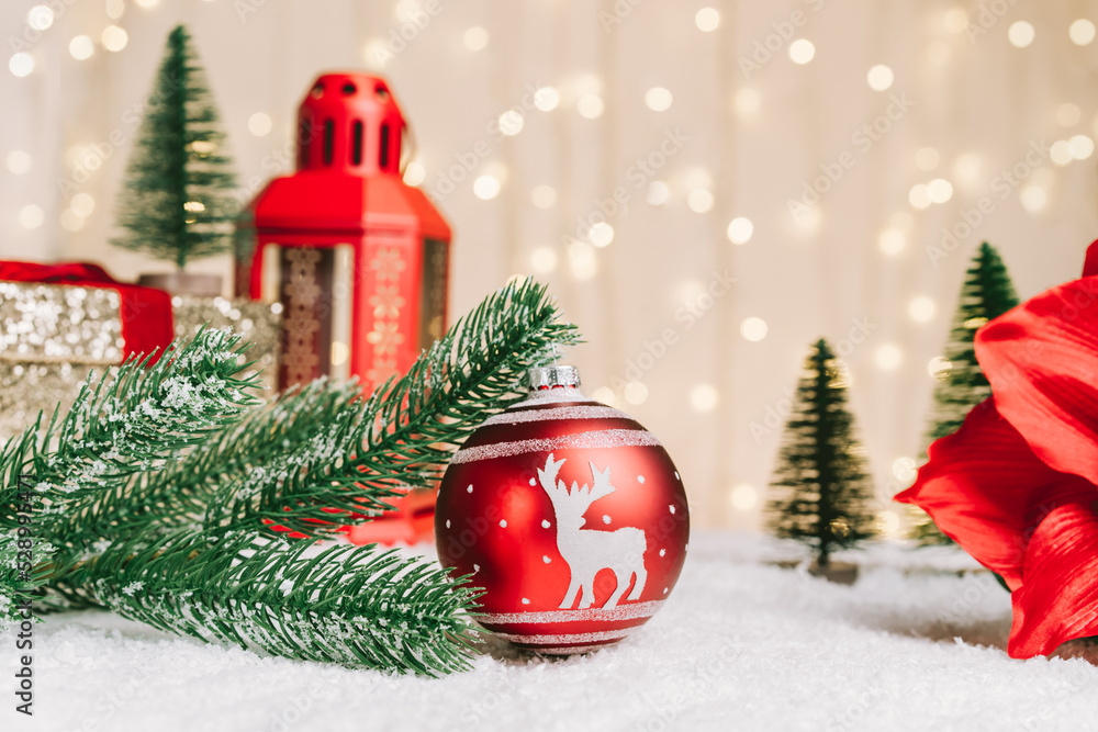 Festive composition with fir tree branch, red bauble ball decor, small Christmas trees, lantern on the snow against a warm lights bokeh background. Merry Xmas and Happy new year. Selective focus.