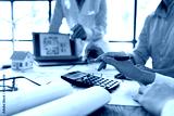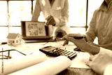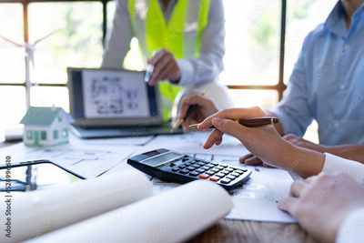 Architecture Engineer Teamwork Meeting, Drawing and working for Architectural projects and engineering tools in the workplace, working ideas on architectural structures.