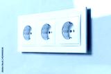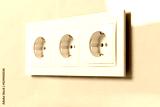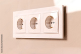 Group of white european electrical outlets on modern beige wall. Selective focus