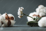 Model toy of battle tank firing cotton flowers from the barrel. Trendy Ukrainian banter about russian propaganda. Peace and no war concept. Macro shot. Bavovna is cotton in Ukrainian. Support Ukraine.