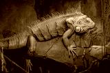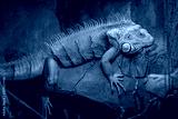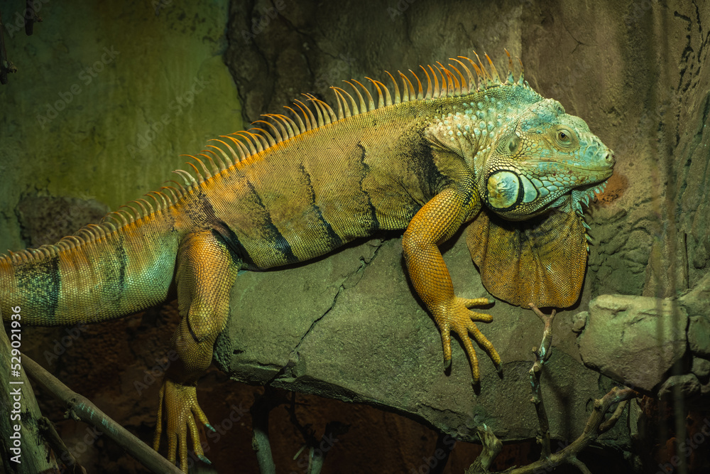 Large green iguana sitting on a stone. American lizard reptile iguana in a terrarium