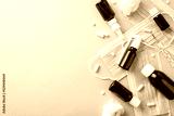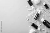Illness concept. Top view photo of medicines syrup and spray bottles face masks pills capsules crumpled paper napkins and thermometer on isolated pastel blue background with empty space