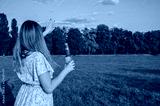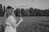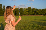 Back view of a girl with a bottle of beer standing on a green lawn and greeting her friends. Holiday and evening relaxation