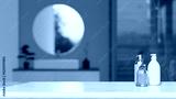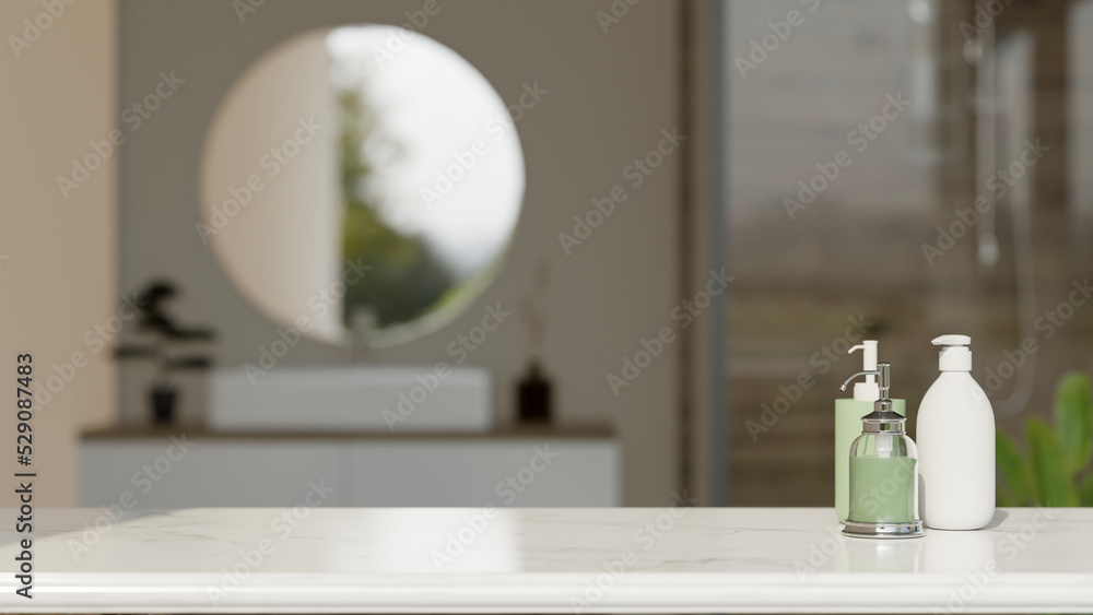 Luxury white marble bathroom tabletop with shampoo bottle, shower gel bottle and empty space