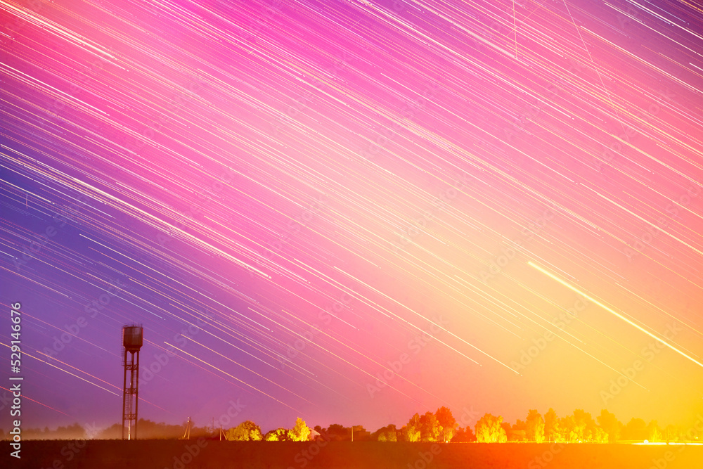Amazing Unusual Stars Effects In Sky. Stars Lines Move Above Rural Landscape Water Tower In Background. Star Trails On Night Sky. Exposure. Soft Colors. Abstract Bright Yellow, Red, Pink Colors.