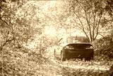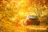 Car Parked On Road, Path, Way, Lane, Pathway In Autumn Forest. Bright Sun Shining Through Canopy Of Trees Woods. Sunlight In Deciduous Forest, Autumn Nature Concept.
