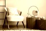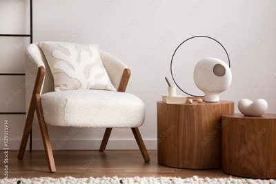 Interior design of retro and elegant living room with design boucle armchair, side table, furniture, decoration, vases, carpet and personal accessories. Template. Stylish home decor.