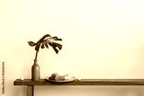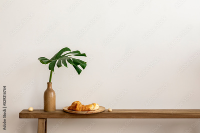 Minimalist composition on the wooden bench with tropical leaf in vase and sweet cake on the plate. Copy space. Living room. Home decor. Template.
