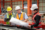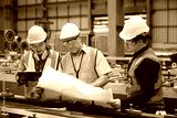 factory workers or engineer planning from work on blueprint drawing paper in the factory