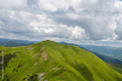 Scenic alpine landscape with mountain scenery with vivid green mountainside, hiking travel concept, conquer the top of the mountains. Carpathians, Ukraine