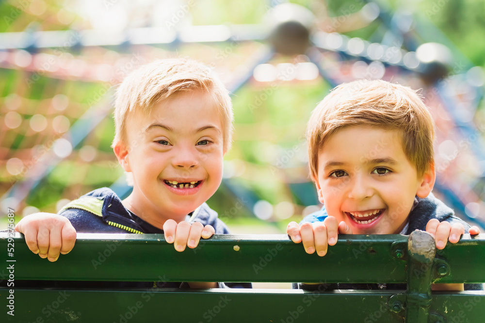 Portrait of a little boy with down syndrome sit on a bench with his brother