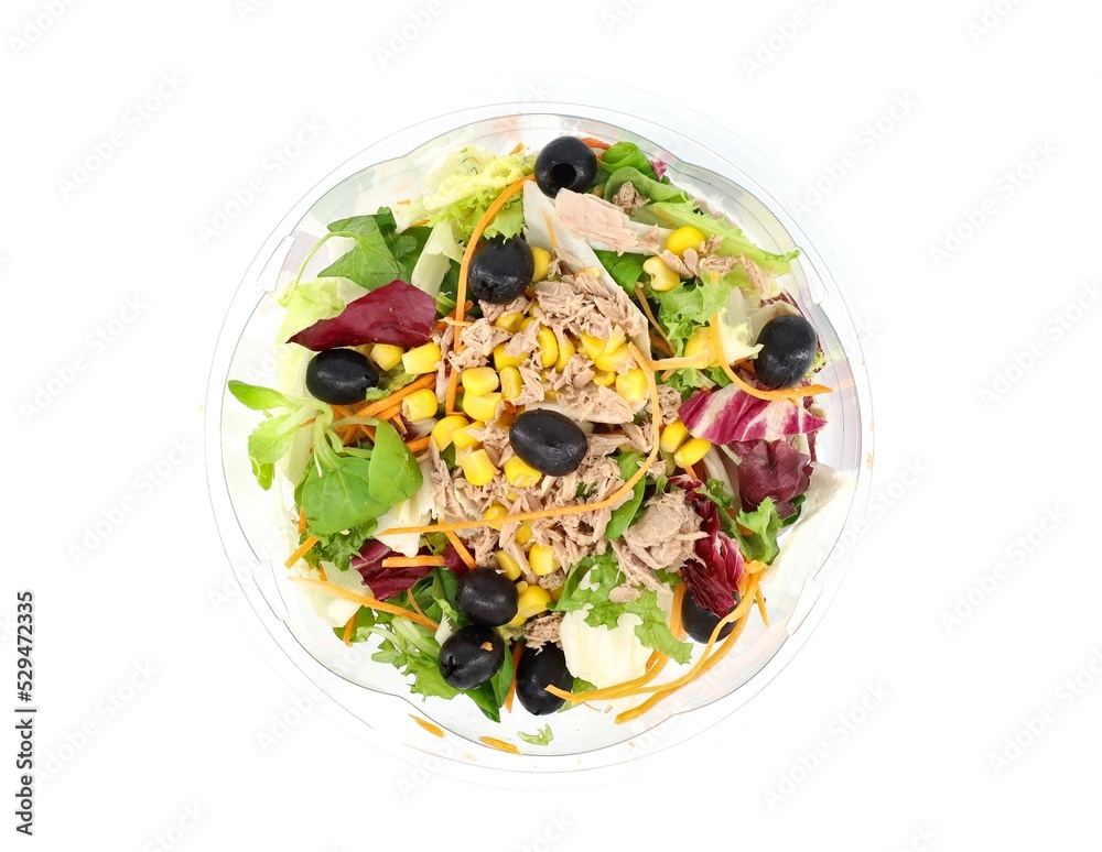 Healthy mixed salad in a transparent bowl. The ingredients are white meat tuna, black olives, corn grains valerian, lettuce and radicchio. Top view on white background