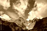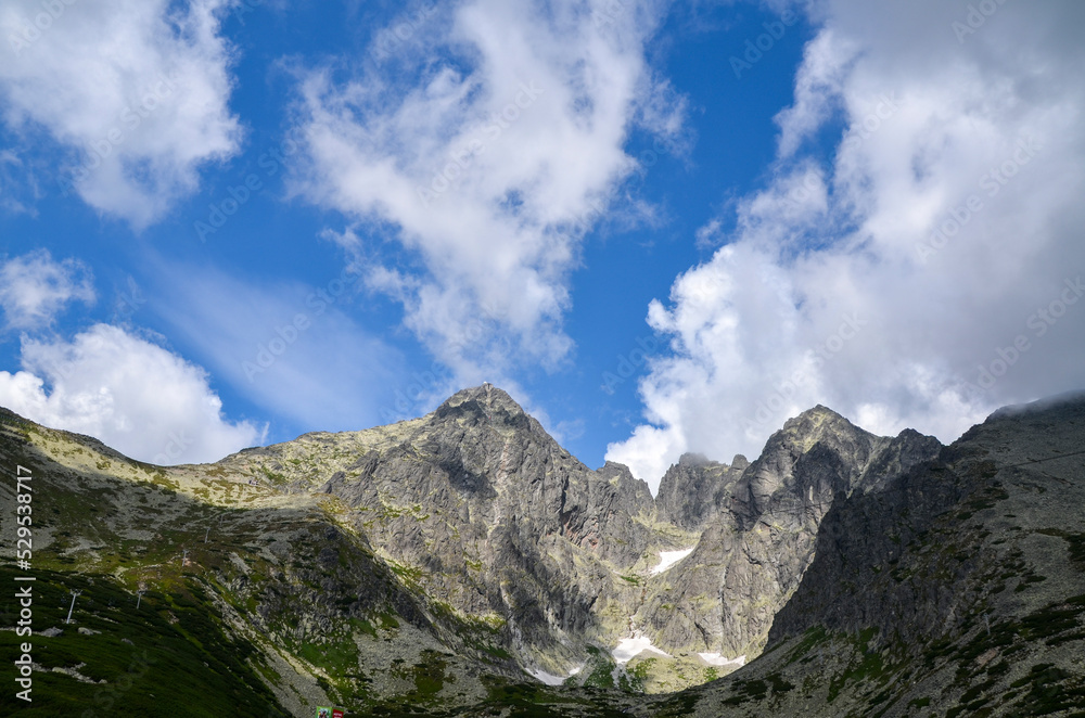 Scenic view of Lomnicky peak and Kezmarsky peak from Skalnate pleso mountain lake. High Tatras, Slovakia