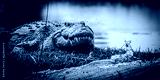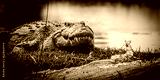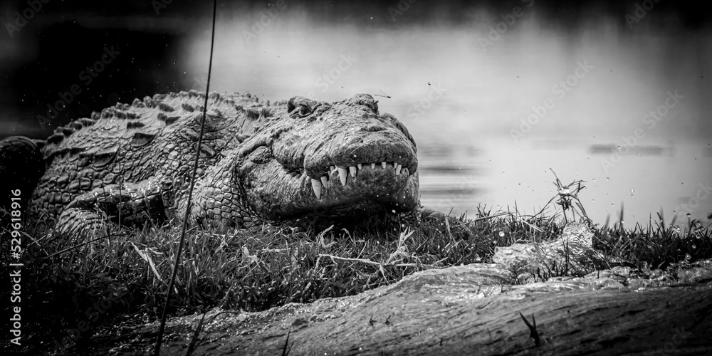 Nile crocodile in black and white basking on the water's edge in the magical Okavango Delta in Botswana. Seen on a Trans Okavango wilderness boat safari in July 2022.