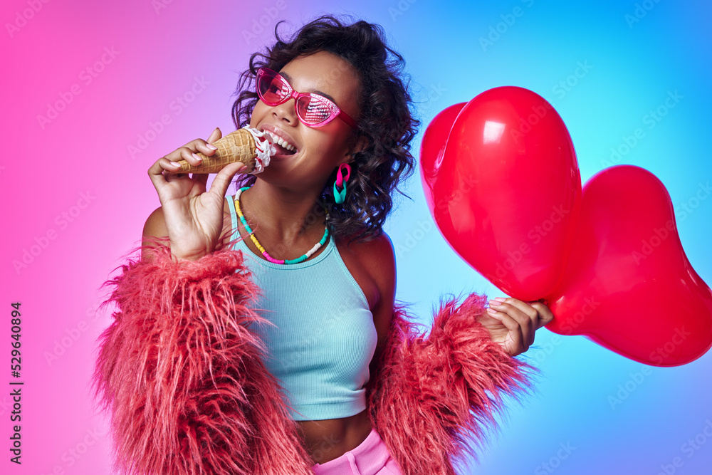 Happy African woman in fluffy jacket carrying balloons and enjoying ice cream against colorful background