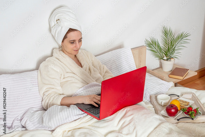 Woman working with laptop, eating fruit breakfast in bed at home or hotel in the morning. Lady wrapping a towel around head. Girl wearing bathrobe on clean white bedding, cozy blanket