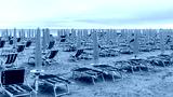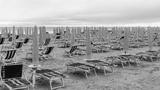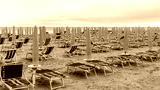 The beach at Lido di Jesolo. Lots of blue sun loungers and yellow umbrellas on the beach. Sunset . Italy