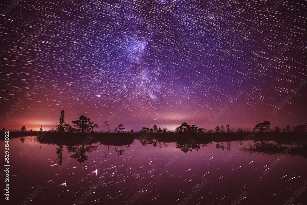 Bright Dramatic Trails Of Stars And Meteors. Fantastic Stars Effect In Sky. Unusual Dusk Natural Background. Sunset Trace Of Sun Above Rural Landscape. Soft Colors. Abstract Dream View.