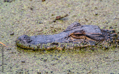 Close up of alligators head in algae pond