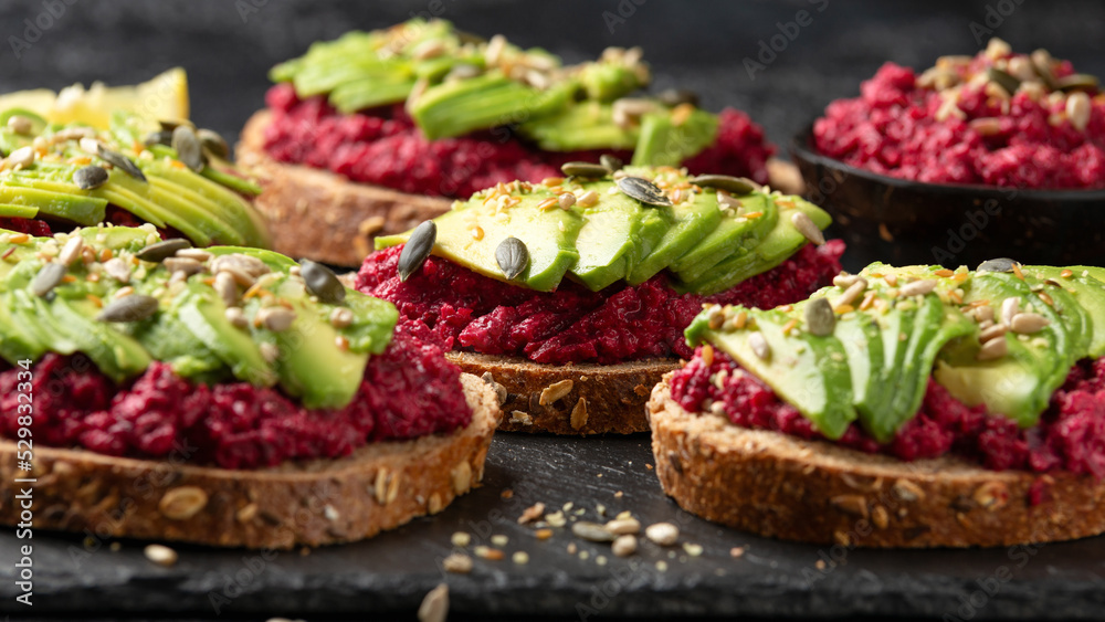 Avocado, beetroot hummus toast on dark sourdough bread topped with pumpkin, sunflower, hemp and flaxseed. Vegan, vegetarian super food
