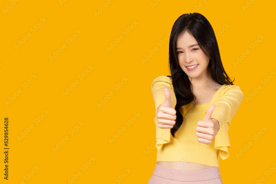 Smiling beautiful Asian woman showing thumbs up isolated on yellow background and copy space Grinning glad accept plan Cheering to you Congratulate good job Approving good idea Like nice outfit