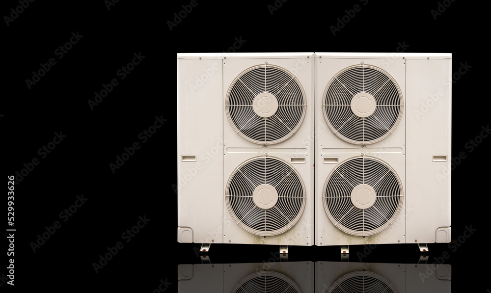 Air conditioner condenser system, condenser outdoor unit, fan close up that is isolated from a white background.