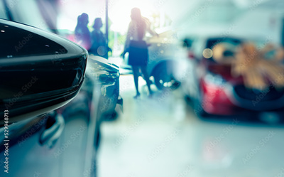 Selective side mirror car on blur saleswoman and customer in modern luxury showroom. Car dealership office concept. Dealer agent business. Automobile leasing service. Dealer company. New car purchase.