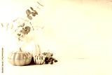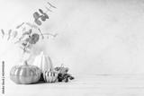Details of Still life, pumpkins, candle, brunch with leaves on white table background, home decor in a cozy house. Autumn weekend concept. Fallen leaves and home decoration