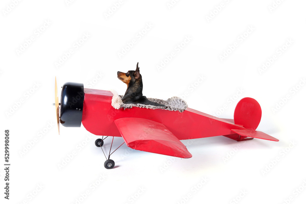 pinscher pilot in old plane red isolated on white